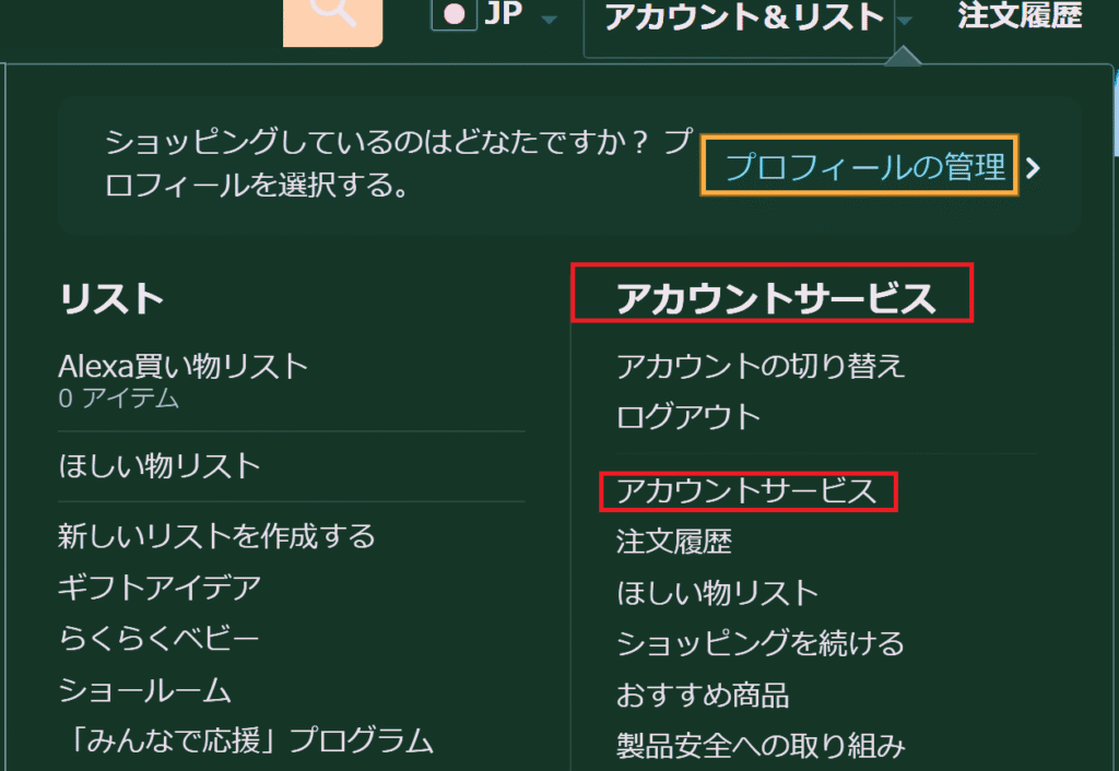 ③表示されるメニューの左側「アカウントサービス」から、さらに「アカウントサービス」を選択
