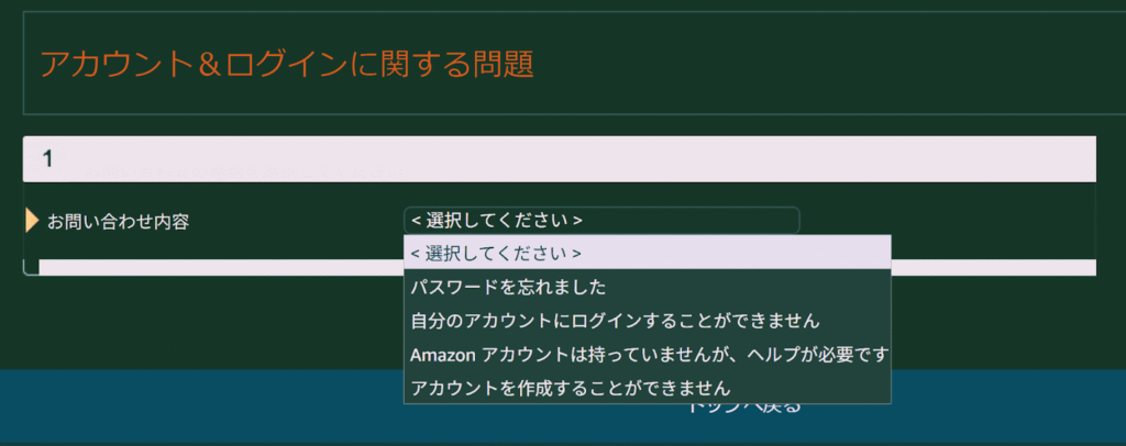 ⑥「1 お問合せの種類を選択してください」の中から「Amazonアカウントは持っていませんが、ヘルプが必要です」を選択するとAmazonへのお問い合わせ先が表示される