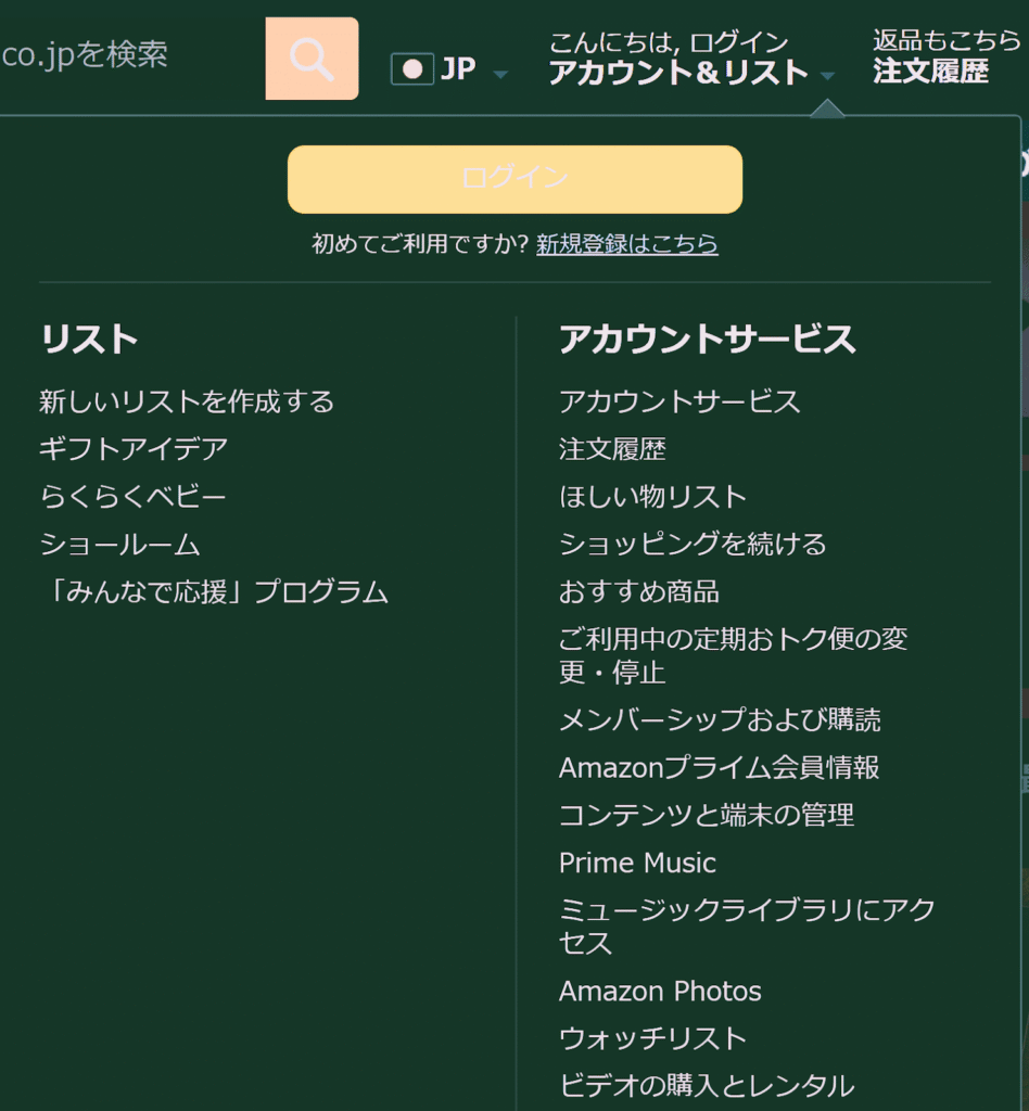 ①Amazon.co.jpのTopページから、「こんにちは、ログインアカウント&リスト」を選択