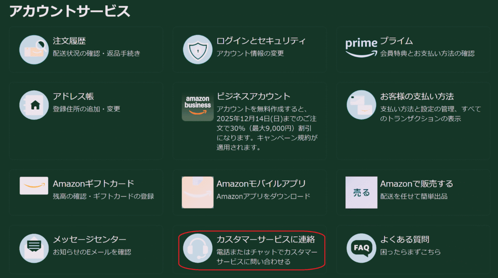 ④「アカウントサービス」のページで「カスタマーサービスに連絡」を選択