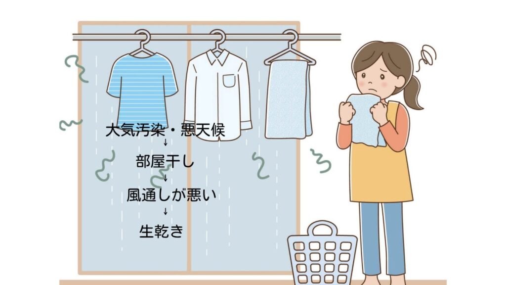 また、空気質や天候が気になって外に干せない洗濯物は部屋干しせざるを得ません。