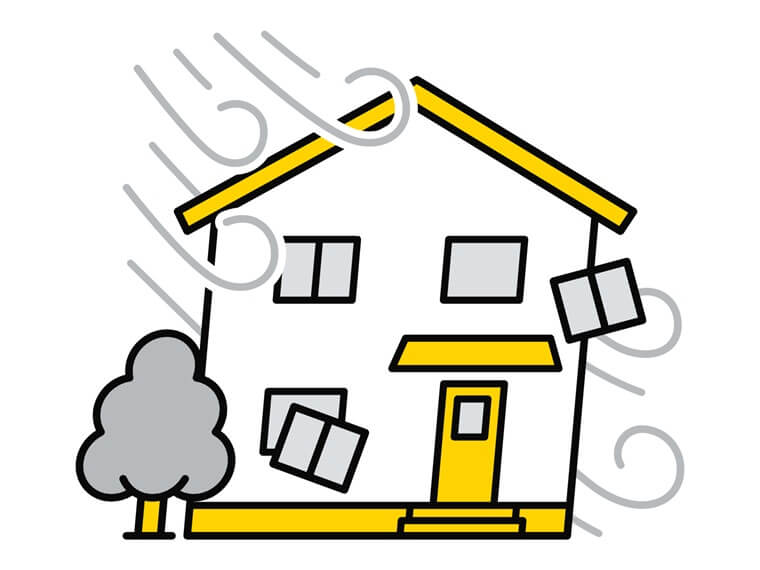 強い揺れや強風で建物全体が倒壊する恐れがあります。倒壊はまぬかれても外壁・屋根材の落下はよくあることです。 老朽化した瓦、外壁材、窓ガラス、看板などが剥がれ落ち、隣の住宅を傷つけたり、歩行者を直撃したりする被害が発生しています。