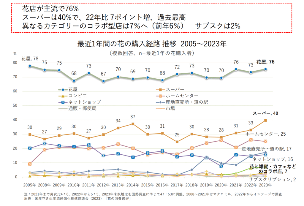 2023年の花の購入経路に関する主な分析結果の特徴は、「花屋」が依然として主要な購入先であるものの、「スーパー」での購入が大きく伸長しているという点です。